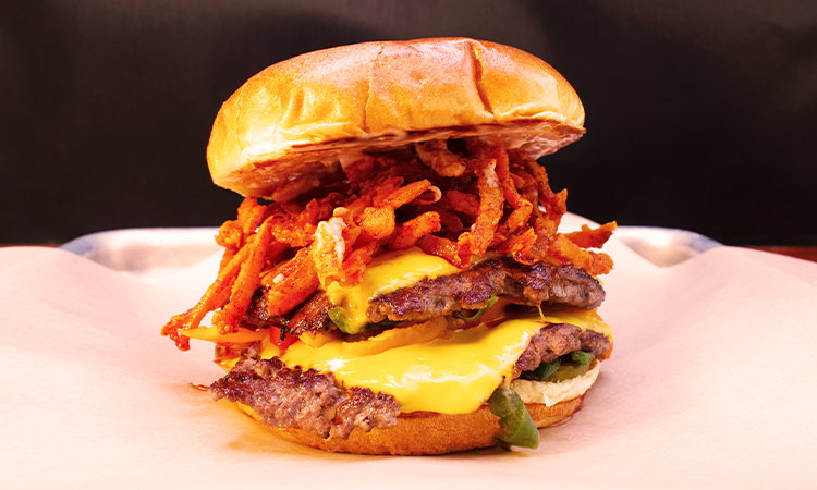 March Special! Double beef patties smashed with onions, fiery jalapenos and diablo peppers. Stacked up with sharp American cheese, flamin’ hot crispy onions and pickles on warm buttery buns with a smear of FiAMMA Sauce.