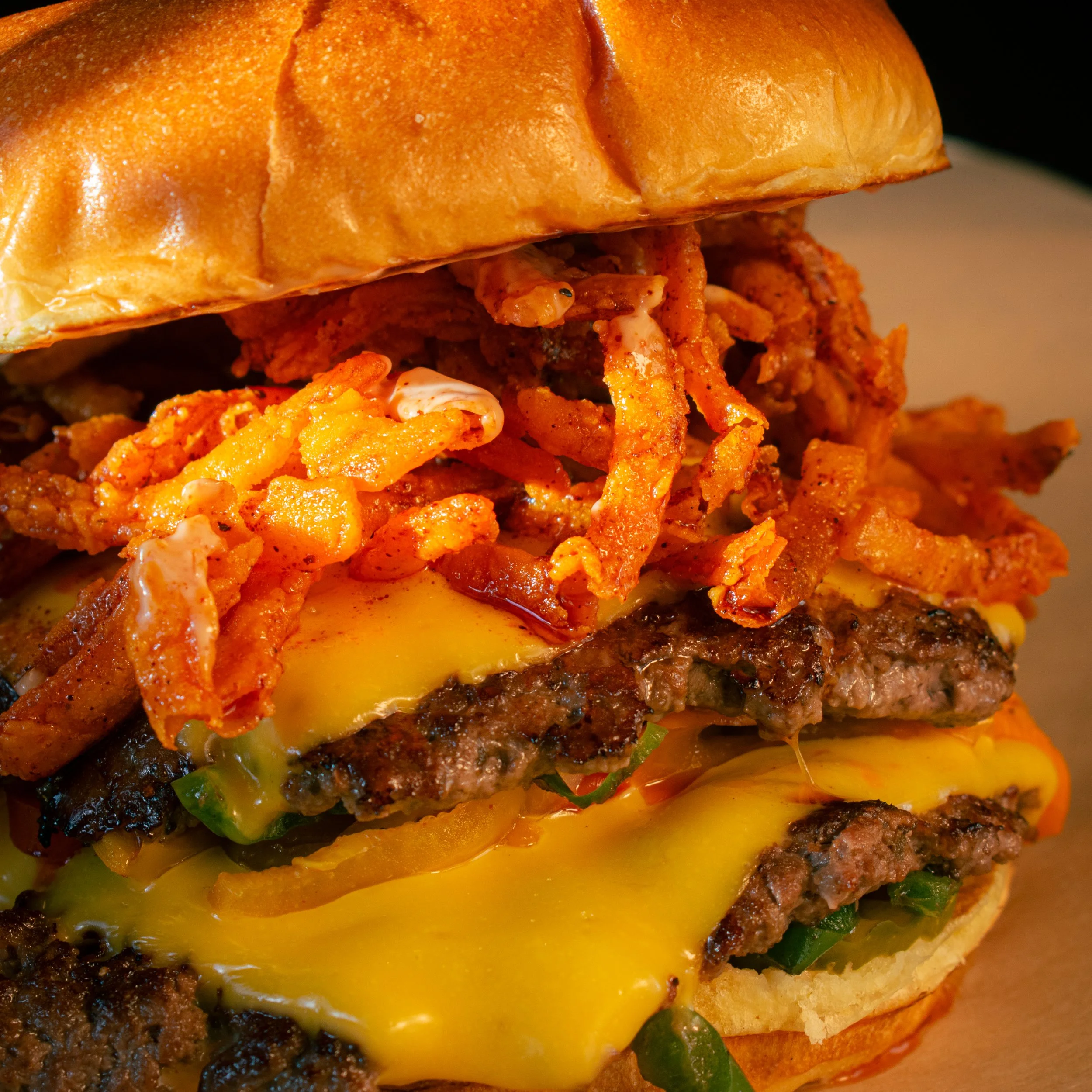 🔥 We heard you’re cravin’ a little heat 🔥 With diablo peppers and jalapeños smashed right into the patty and a hearty stack of house made flamin’ hot crispy onions, this one might just bring a tear to your eye. Double beef patties smashed with onions, fiery jalapenos and diablo peppers. Stacked up with sharp American cheese, flamin’ hot crispy onions and pickles on warm buttery buns with a smear of FiAMMA sauce.